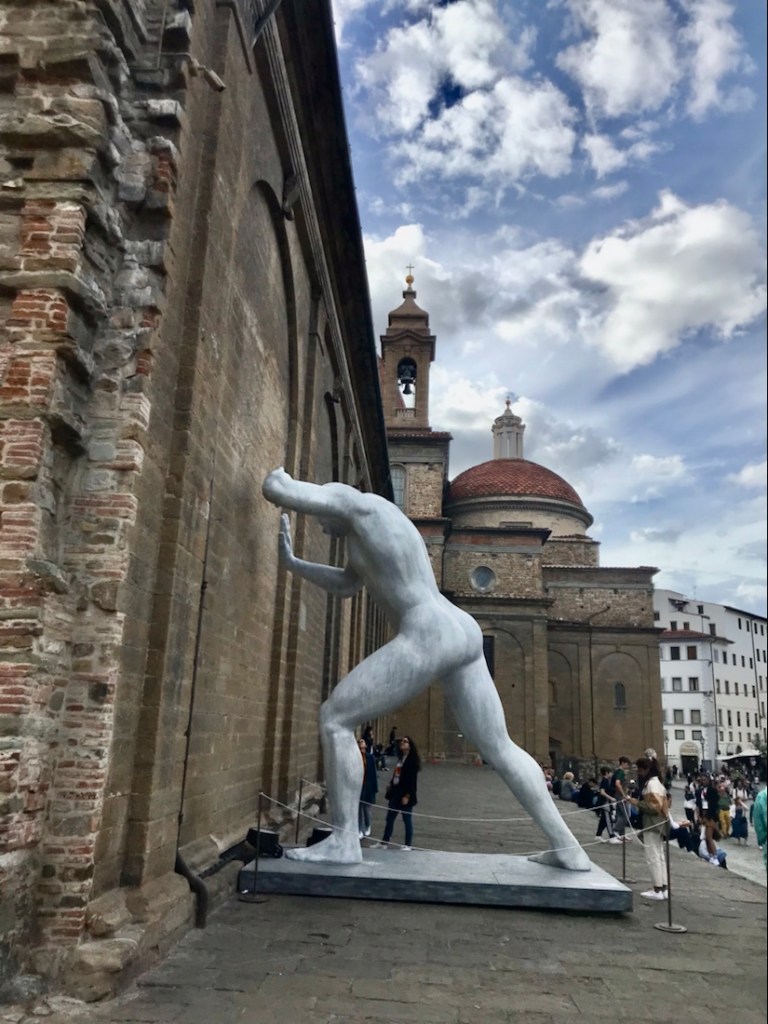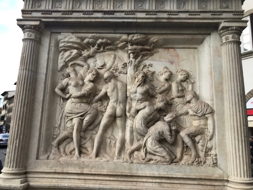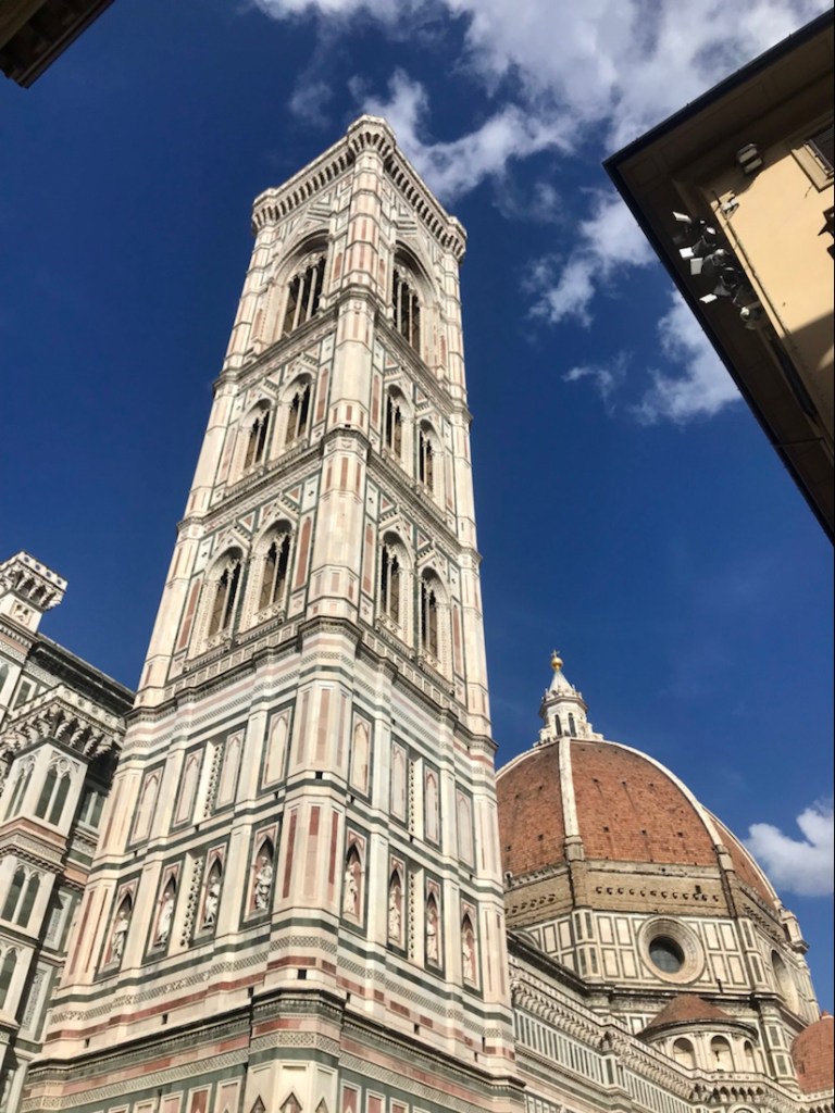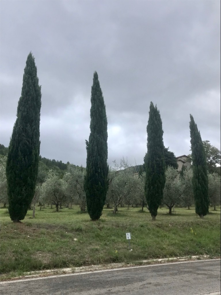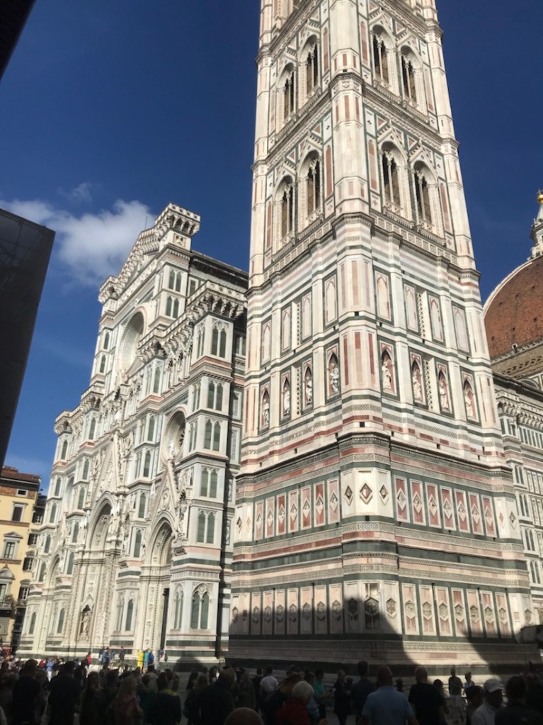 Ce sera tout pour notre trajet en vélo. Départ en train de Brisighella sous un beau soleil. Une heure de train avec de nombreux tunnels pour passer sous la montagne. Arrivée à Borgo, temps gris et vent. Parcours entièrement sur la route. Côtes pour commencer. Averse avec coup de vent qui nous fait mettre les vestes de pluie. Averses intermittentes. 14 km de descente sur route mouillée avec de la circulation… ce ne fut pas notre parcours le plus agréable depuis le début de notre périple. Dommage car la descente de Fiesole jusqu’à Florence a de jolis points de vue mais avec le vent, la pluie et la circulation, ce n’est pas le rêve.