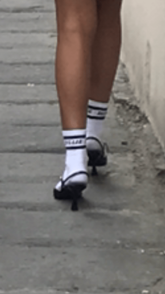 Je n’ai pas pu m’empêcher de faire la photo. C’était trop drôle, des belles socquettes blanches avec des talons hauts.