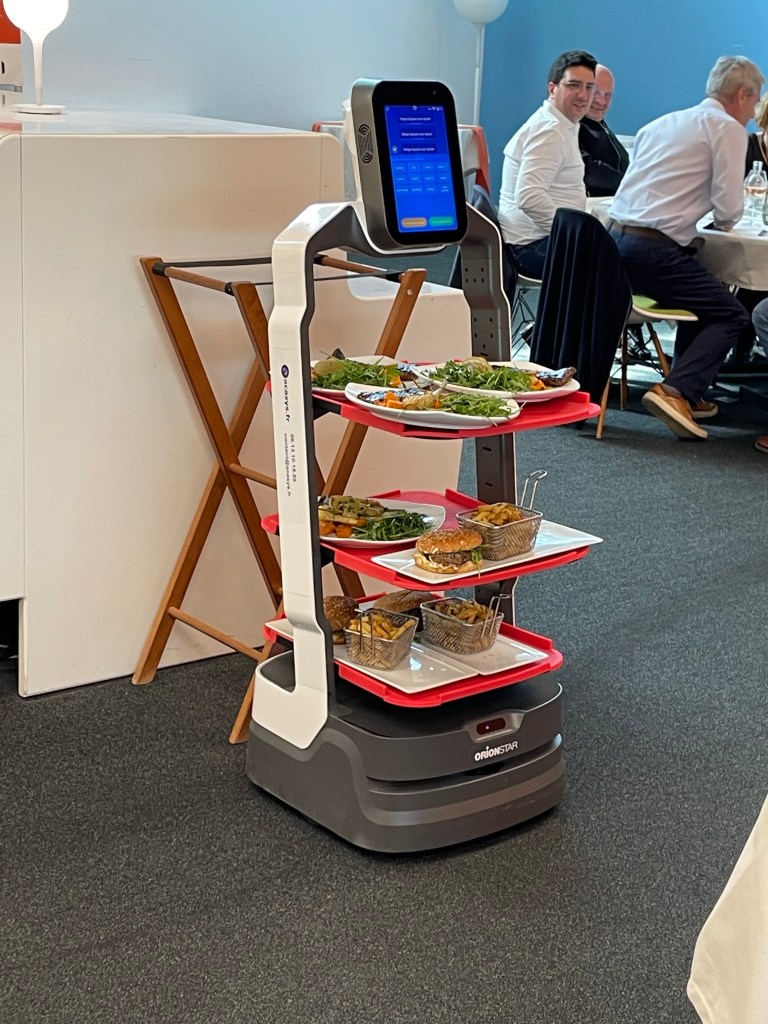 Petit robot qui amène les plats dans le restaurant de l’aéroport. C’est le serveur qui les pose sur la table. L’être humain n’a pas encore été complètement remplacé…