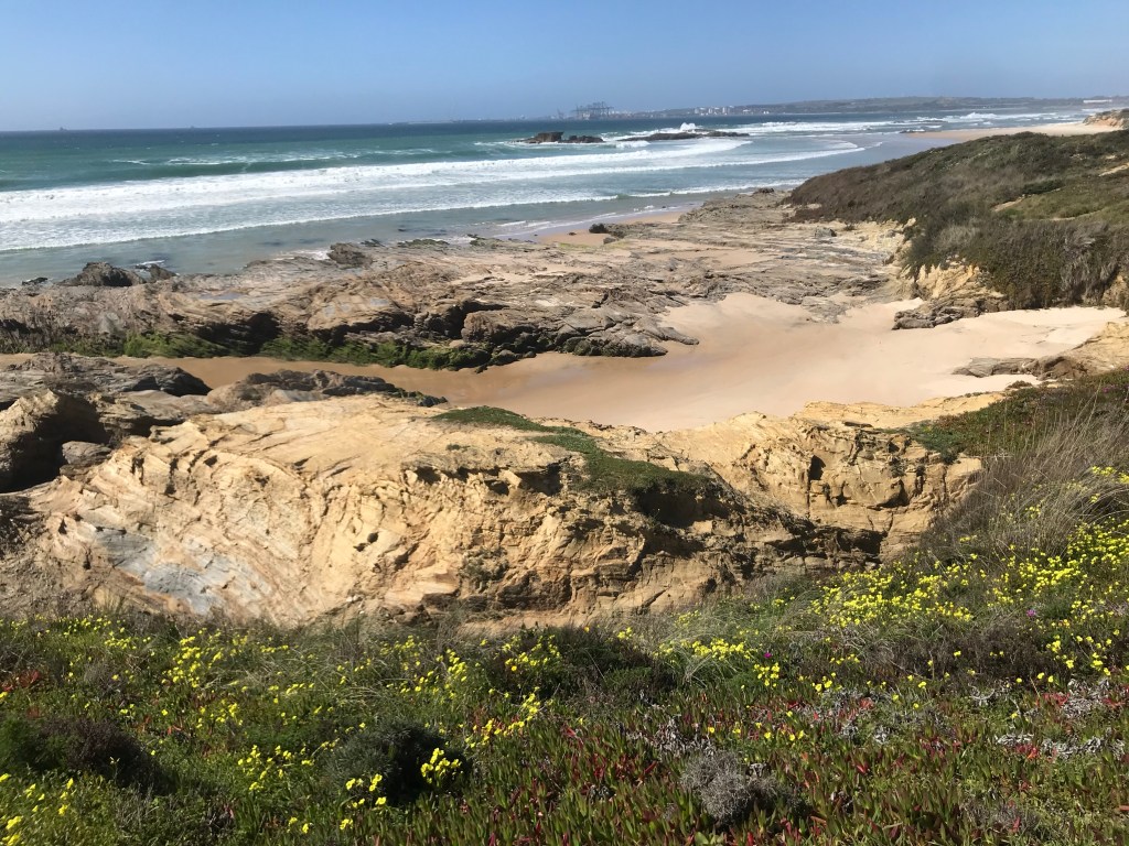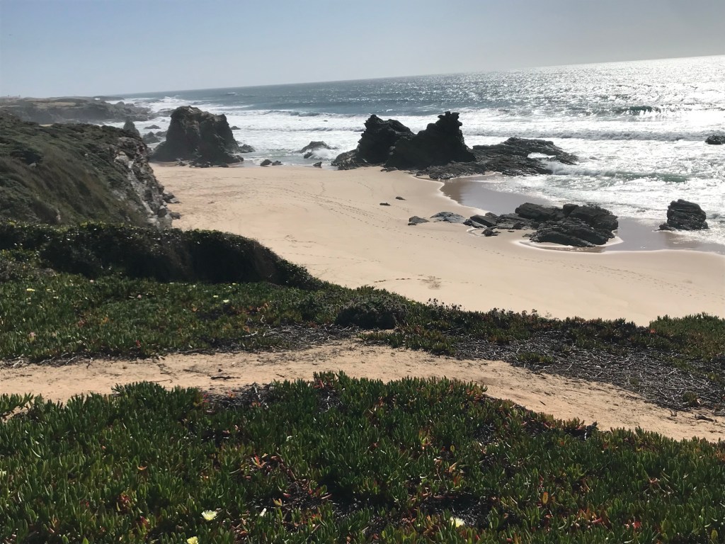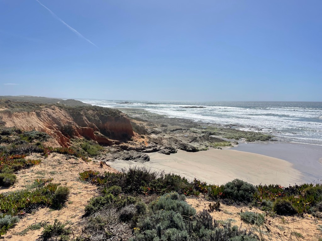 Et voilà la plage de São Torpes. Nous allons pouvoir boire, manger, nous reposer et nous tartiner de crème solaire avant de commencer la première étape de la Rota Vicentina.