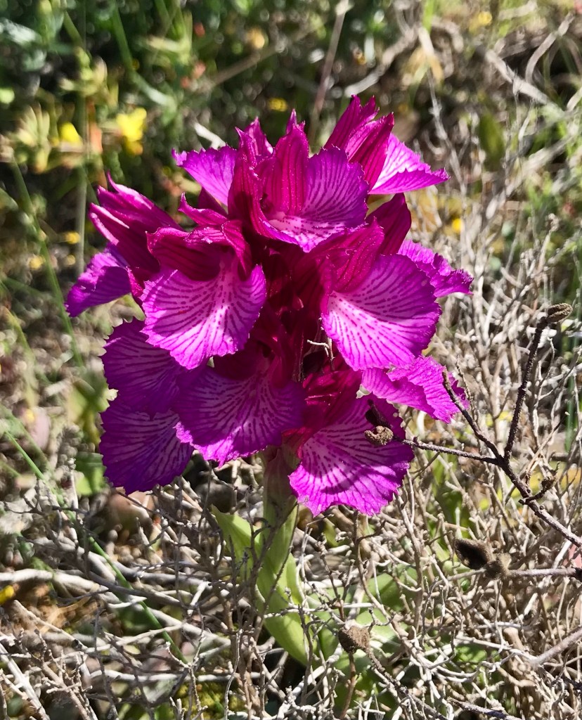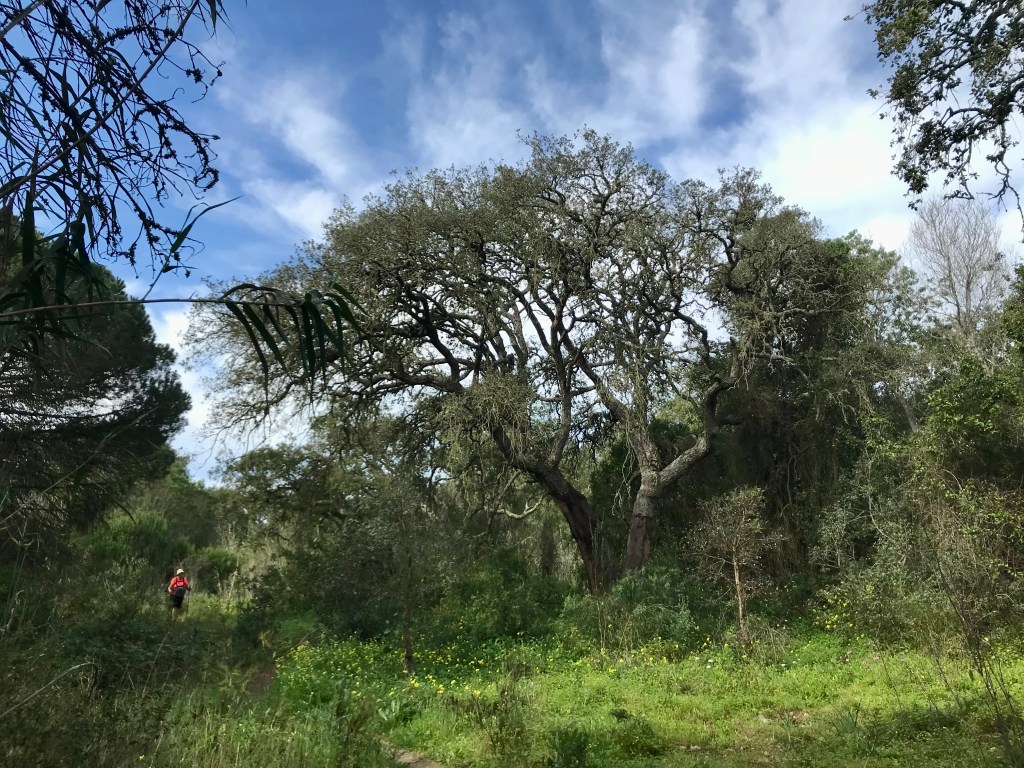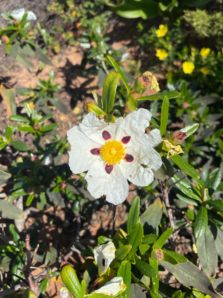 Et là, quel bonheur, un ciste à gomme, celui qui pègue quand passe au milieu. Souvenir d’un jour en 2012 sur la rota Vicentina où je n’avais pas voulu grimper sur la falaise et où j’avais préféré traverser un champ de cistes pour rejoindre le village dont j’ai oublié le nom. Mauvaise idée, nous sommes arrivés à destination pleins de griffures et de colle. La fleur est magnifique, pleine de fragilité.
