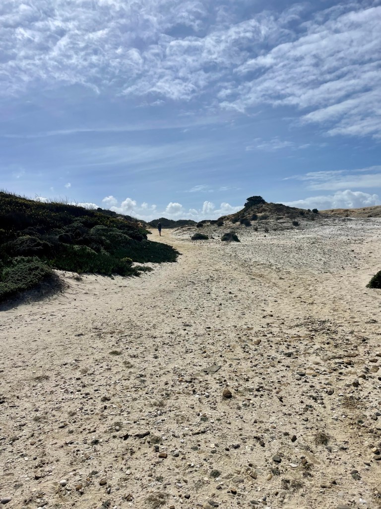 On commence par descendre vers la plage, ça veut dire qu’il faudra remonter. Le plus souvent sur un petit chemin étroit, caillouteux et escarpé… j’adore, évidemment je veux dire le contraire. Mais ce que je redoute le plus c’est lorsque nous avons ce petit chemin en descente.