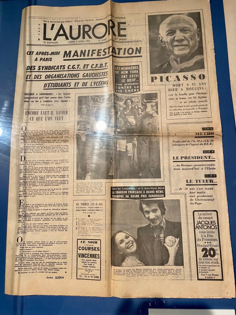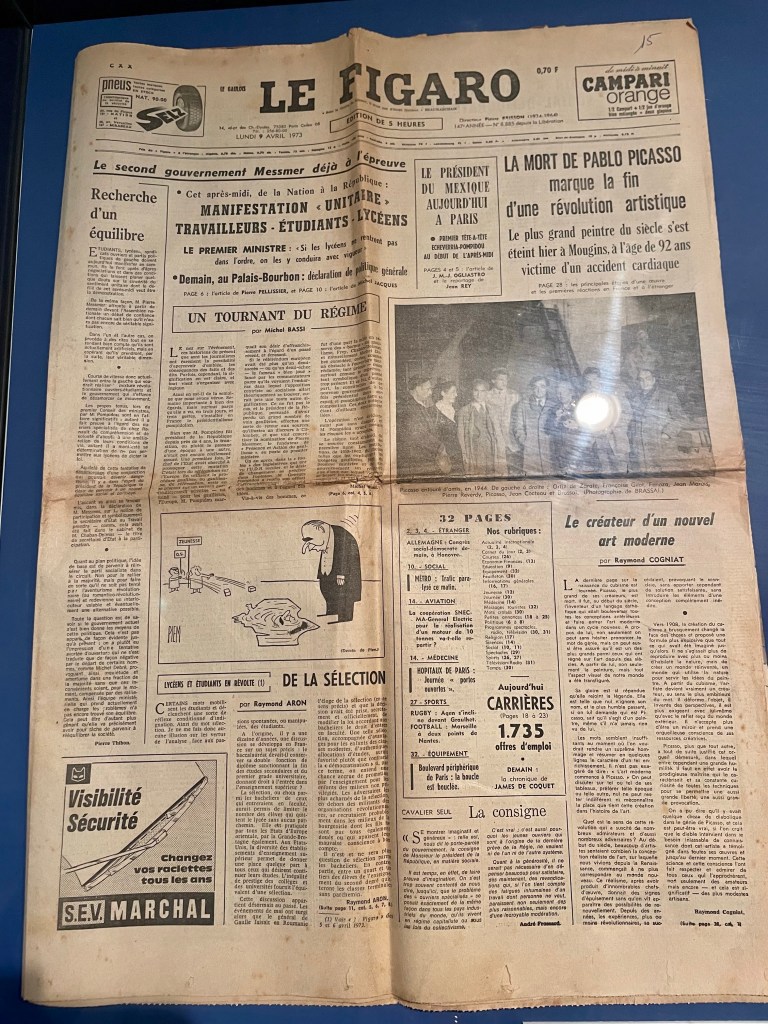 Ça commence par les journaux publiés le lendemain de son décès le dimanche 8 avril 1973 à Mougins. Il y avait des manifestations aussi à cette époque.