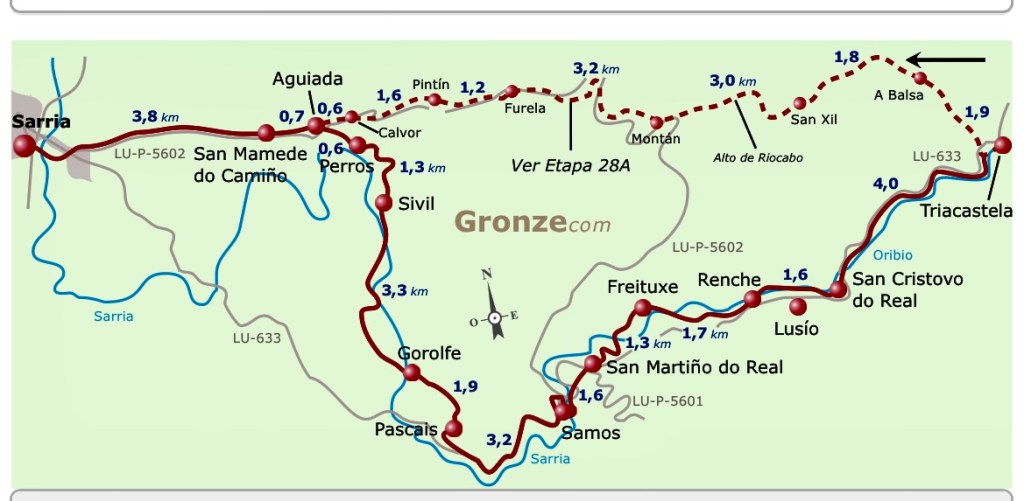 Aujourd’hui, il y avait le choix avec 2 chemins, un de 17,8 km et un autre de 25 km, nous avons choisi le plus long, celui du bas de la carte, car il passait par un monastère.