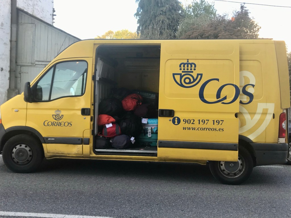 Et maintenant la journée du pèlerin. Comme chaque jour, tournée de ramassage des bagages. Il n’y a pas que la poste qui le fait.
