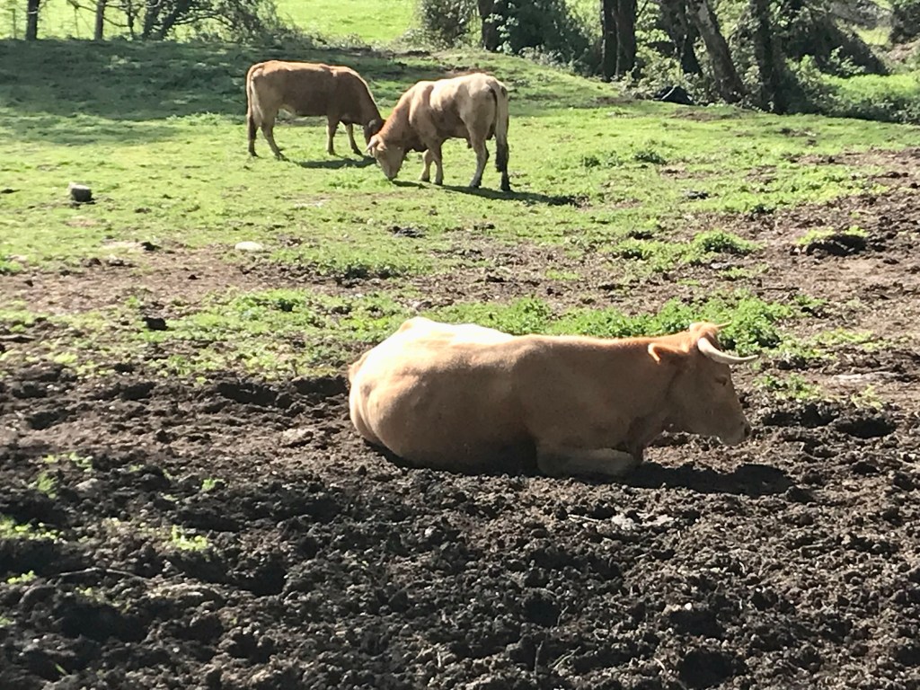 En face de moi des espagnols se sont arrêtés pour manger, j’ai engagé la conversation, ils sont partis de Sarria à 7 h30… aïe aïe aïe est-ce que je vais devoir attendre Yves qui est parti à 9 h… et non, mon champion arrive peu de temps après !!!