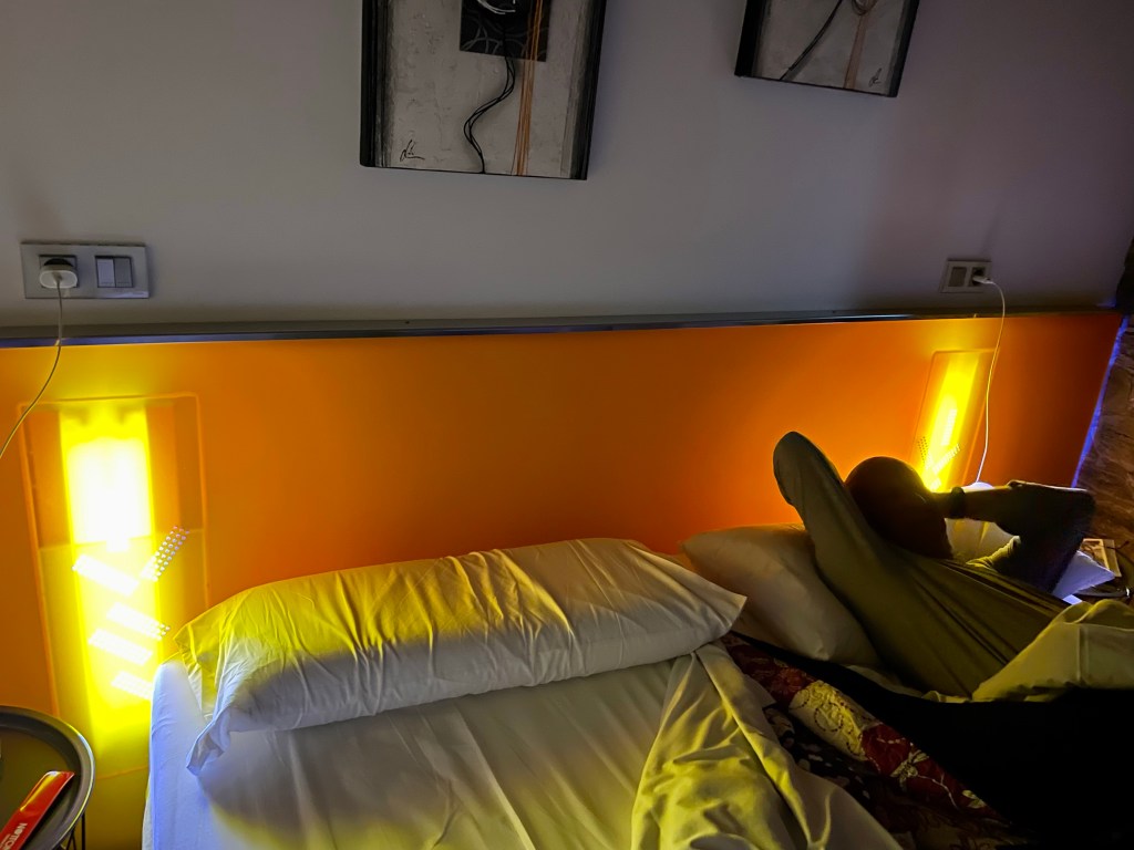 A Salceda. Notre chambre moderne, tellement moderne, que chaque fois que l’on s’approchait de la salle de bains, la lumière s’éclairait et la ventilation se mettait en route. Sympa, lorsqu’on se lève plusieurs fois dans la nuit !!!
