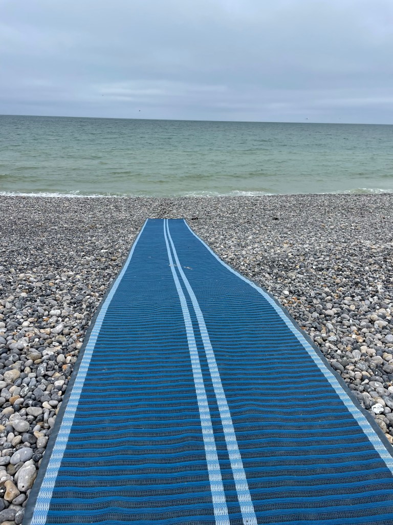 Enfin un passage entre les cabines. Plage de galets.