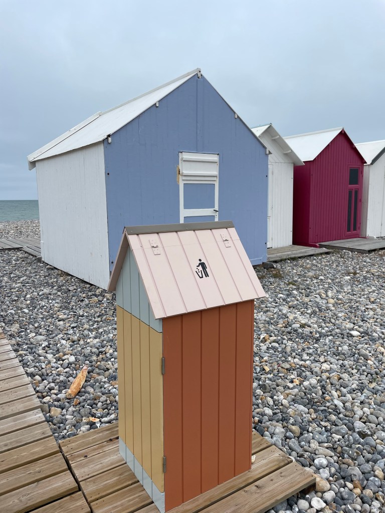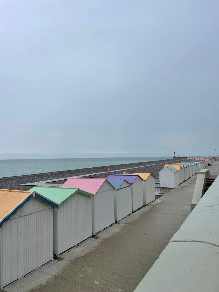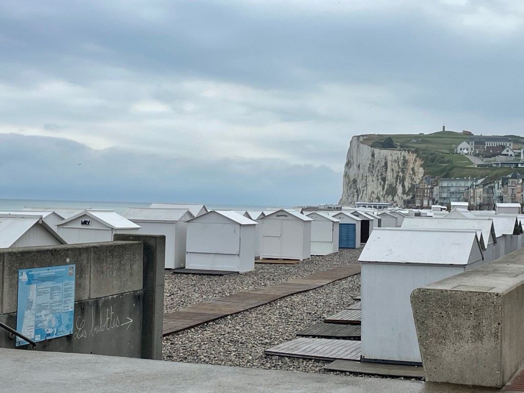 Et comme d’habitude des cabines sur la plage. Dans le fond les falaises du Tréport.
