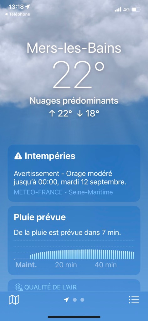 Nouvelle annonce météo. Ce sera bien vrai. Nous mettrons les habits pour la pluie en sortant du restaurant.