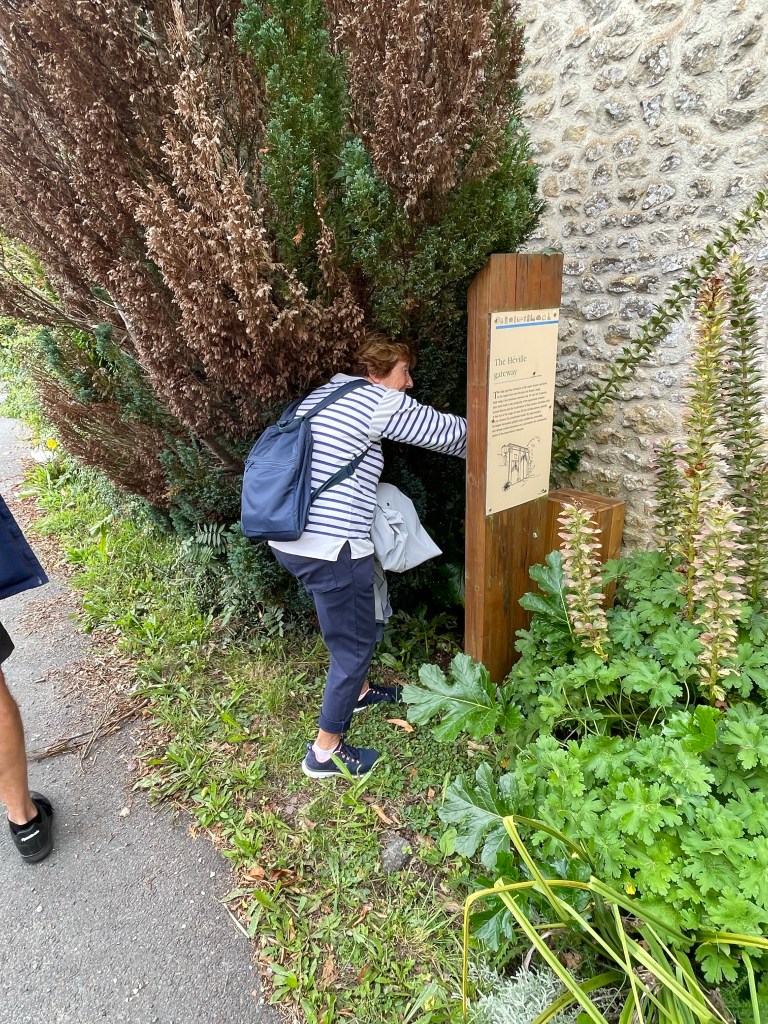Pour pouvoir lire le panneau en Français, Christine est obligée de passer dans les arbres.