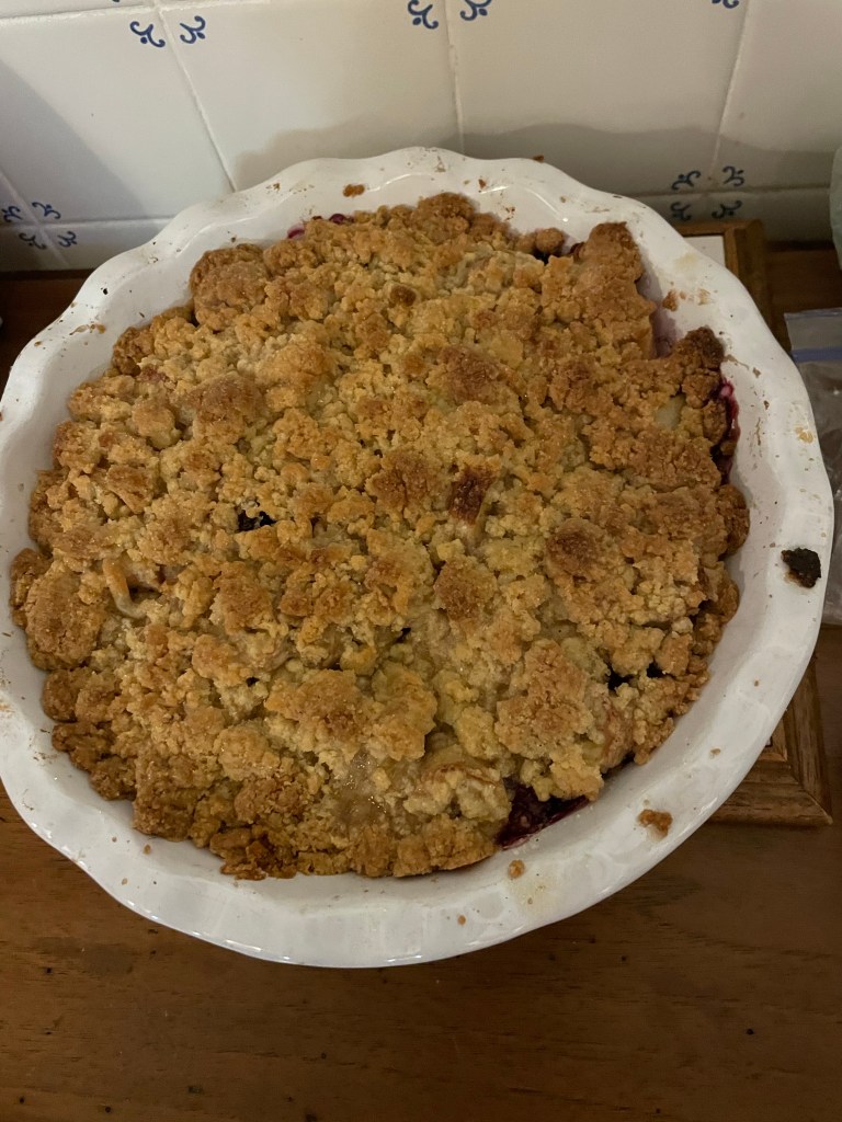 Voilà le crumble de Christine fait avec les poires du jardin, les mûres ramassées au bord de la route et des bananes ramenées dans les sacoches.
