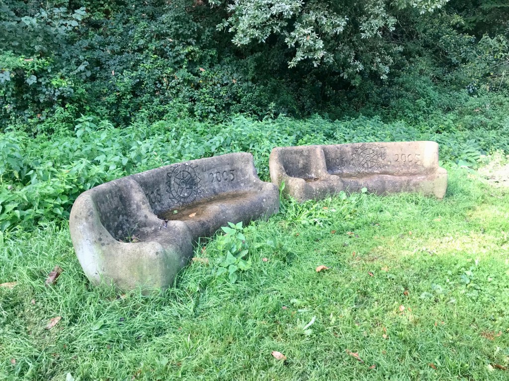1905 – 2005 est écrit sur ces fauteuils en béton qui sont disposés régulièrement le long de la rivière. On ne sait pas la signification.