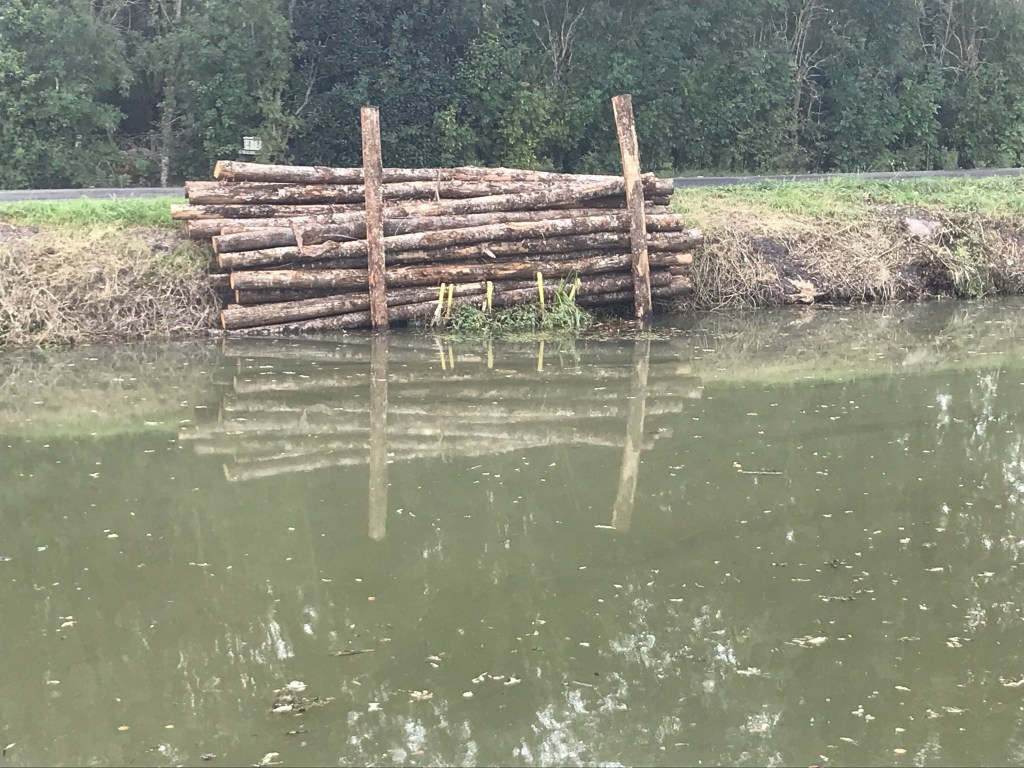 Ils sont en train de réparer les berges du canal. Les troncs d’arbres sont prêts.