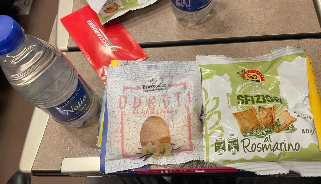 Le train vient de démarrer lorsque le personnel passe avec un chariot et donne à tout le monde une petite bouteille d’eau, un sachet de biscuits salés, un sachet de biscuits sucrés et une serviette. Sympa car il y a une voiture bar pas loin.