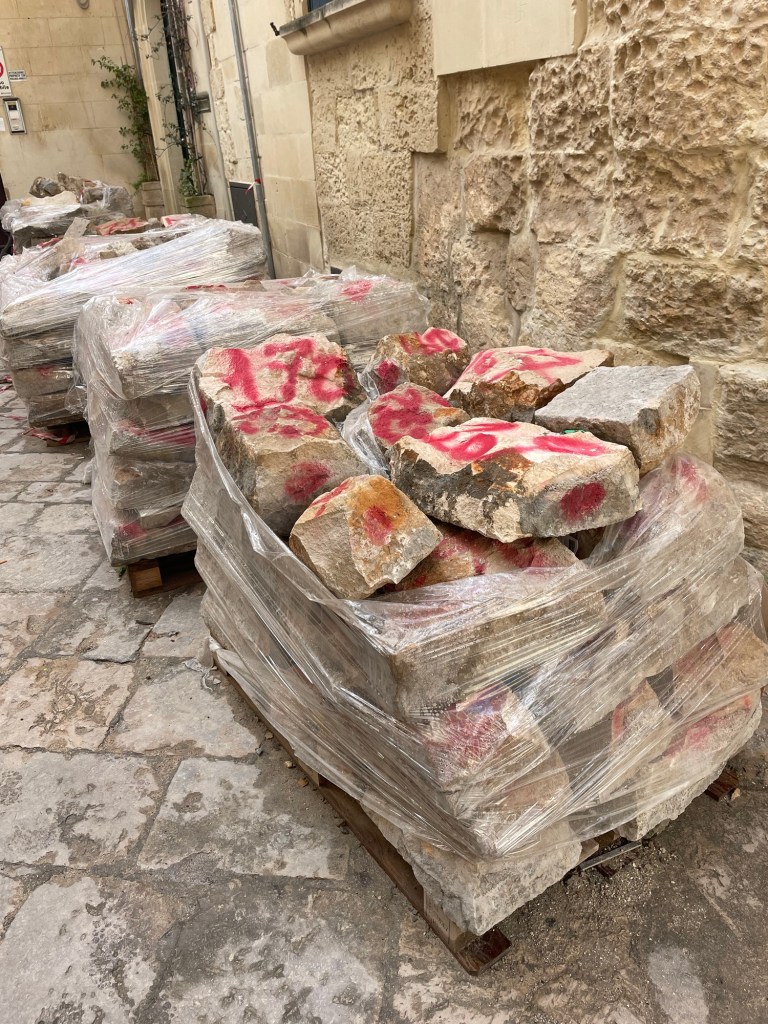Reconstruction de la rue pavée. Toutes les pierres ont été numérotées.