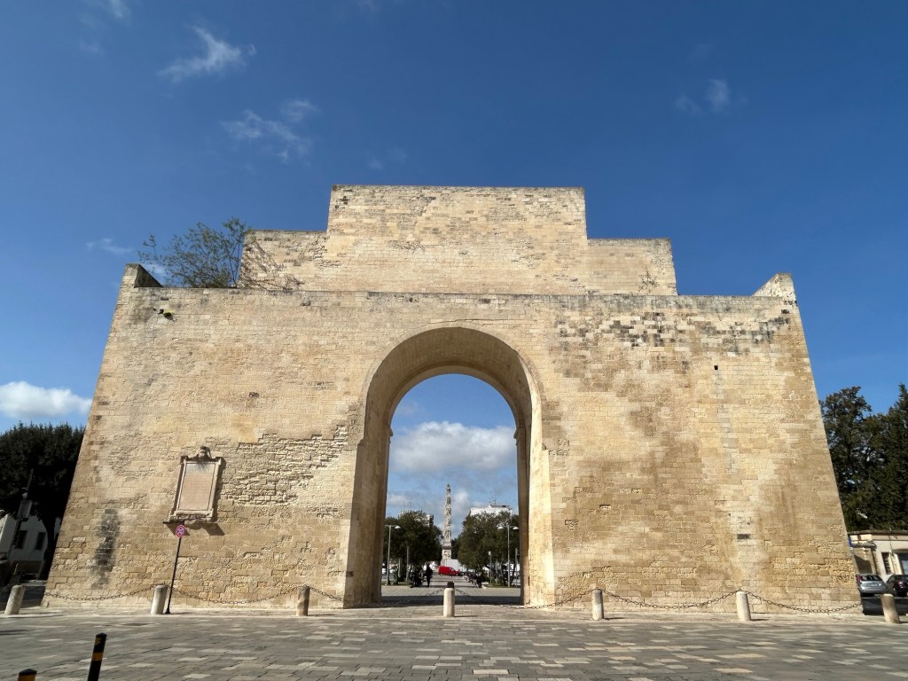 Porta Napoli. Point de départ de la première étape du Cammino del Salento que nous allons suivre pendant quelques jours. Nous l’avons vue aujourd’hui, nous n’y reviendrons pas demain car notre hotel est de l’autre coté de la ville.