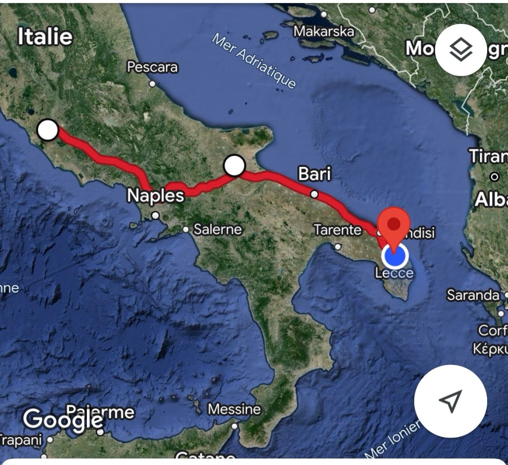Arrivée à Lecce à 23 h, bien fatigués nous avons pris un taxi pour aller à l’hôtel qui était à 2 km de la gare.