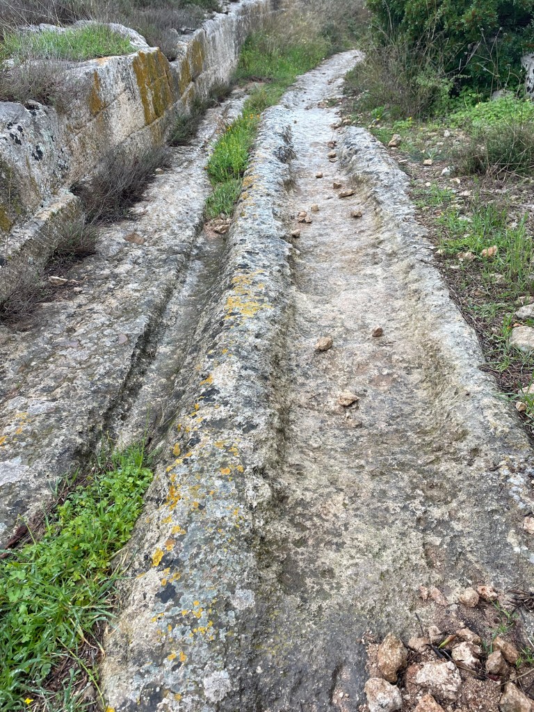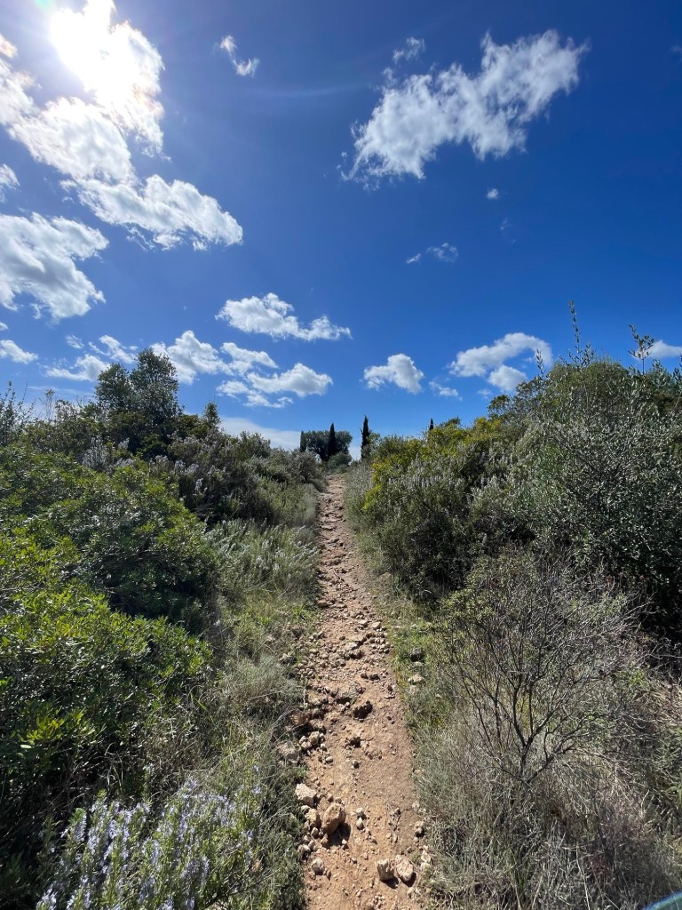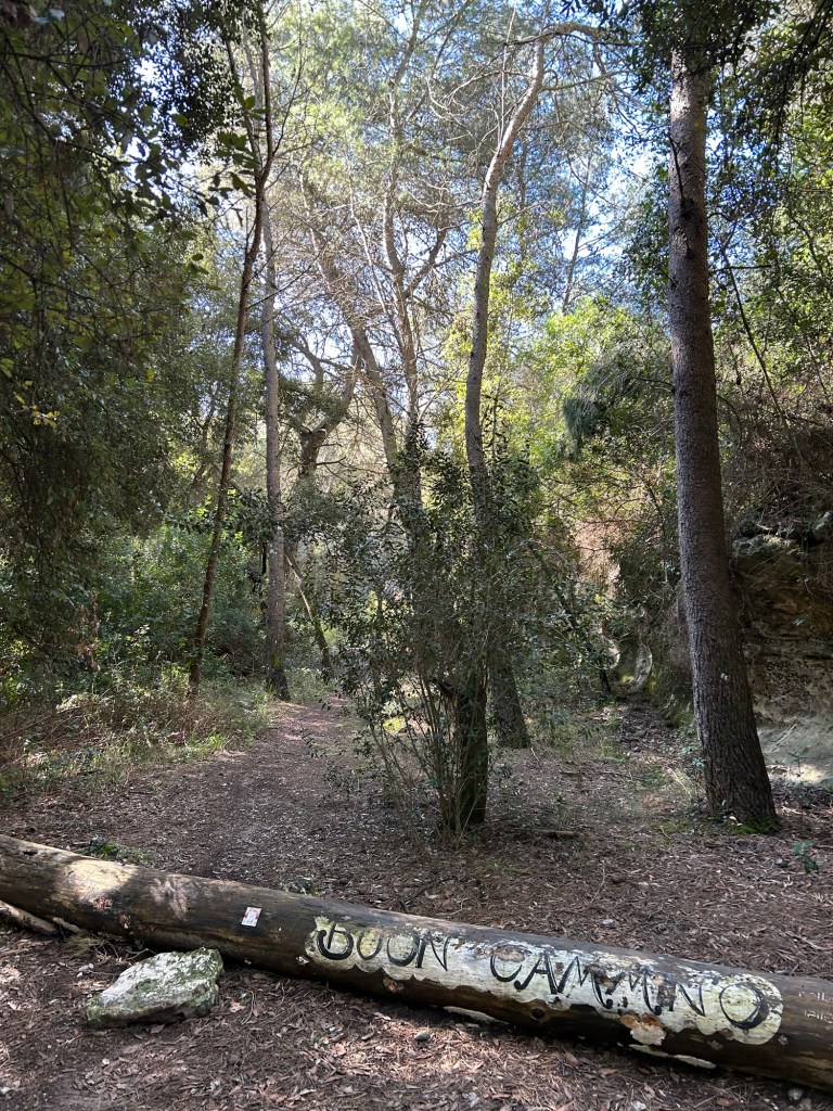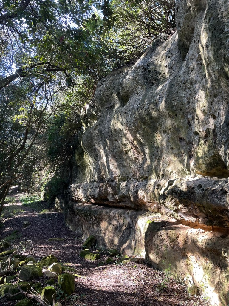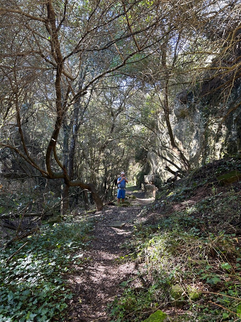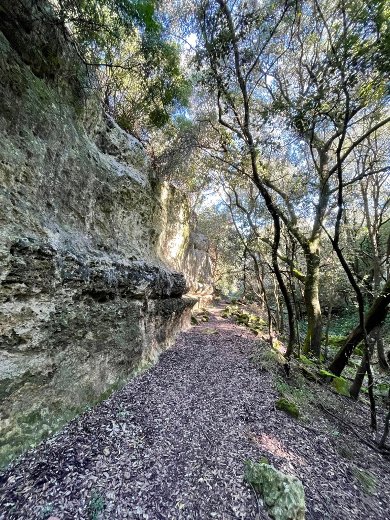 Nous marchons sur un sentier à l’intérieur d’une petite gravine, un canyon karstique.