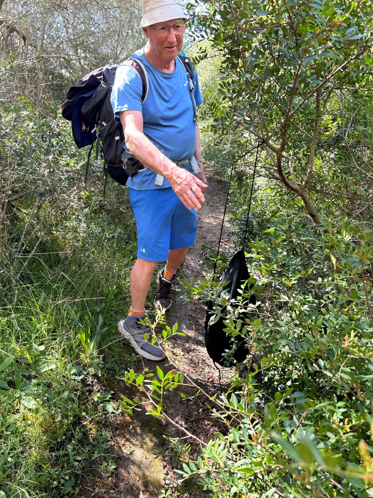 Mais qui est-ce qui a laissé un sac ici? Heureusement que je marche derrière Yves, c’est la lanière de son sac à chaussures qui s’est accrochée dans les buissons et qui a fait sortir le sac sans qu’il s’en rende compte.