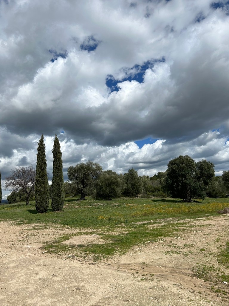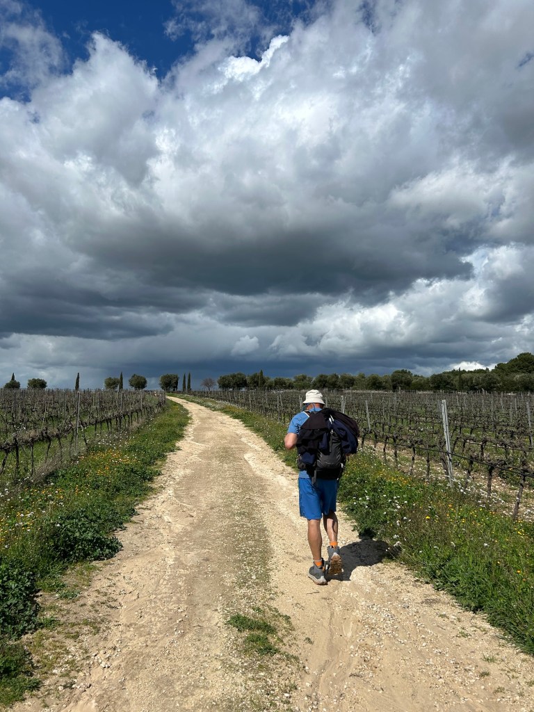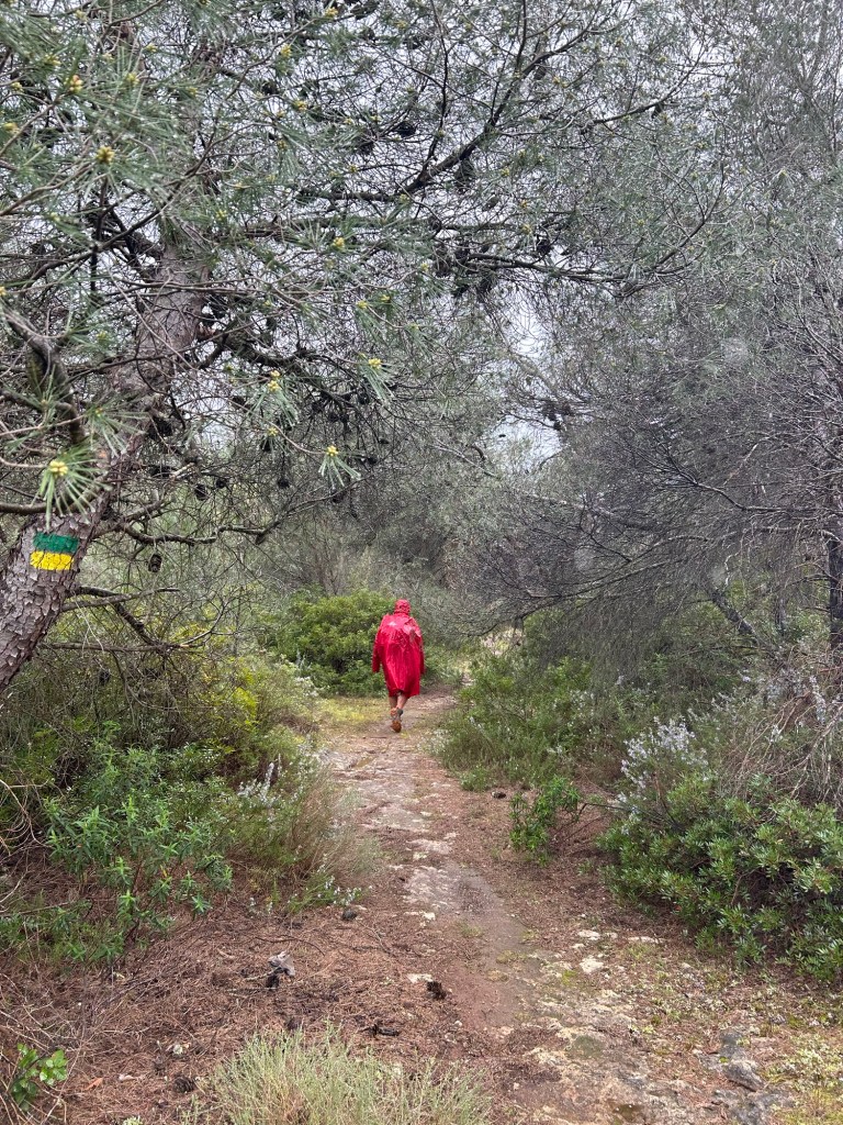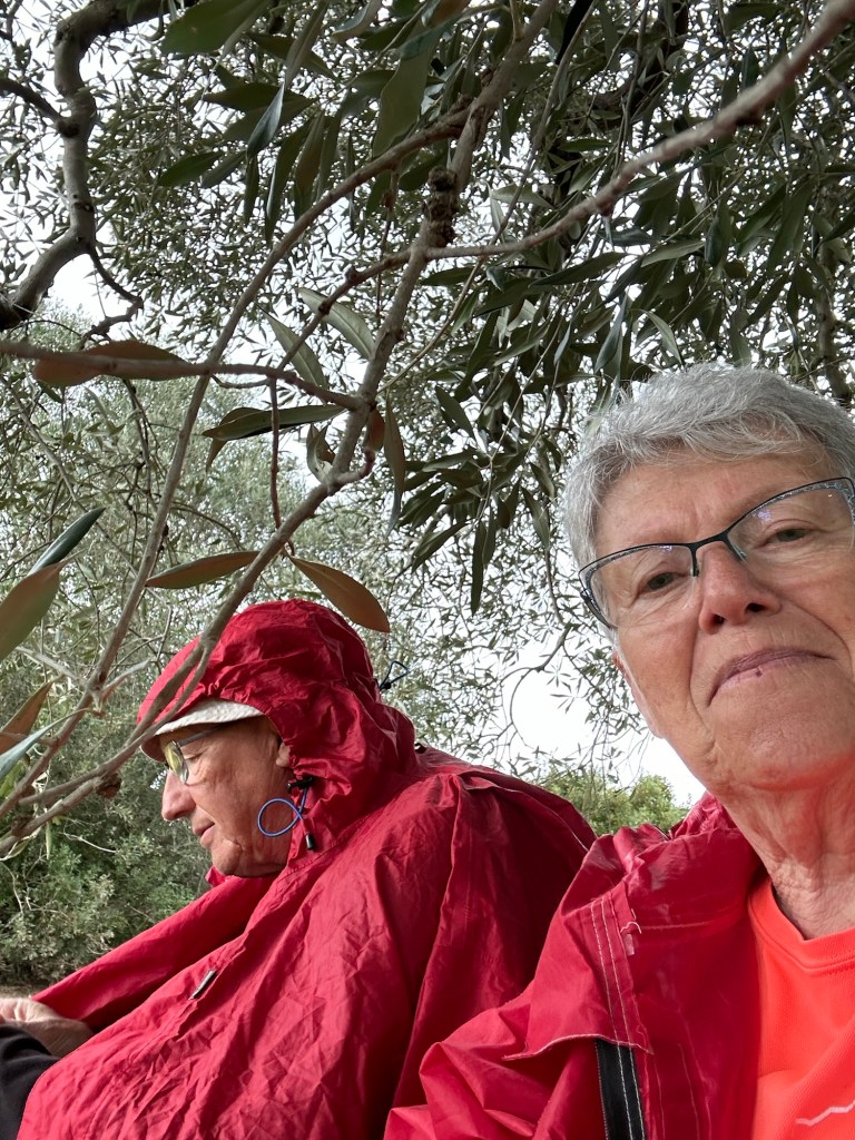 Il commence à pleuvoir, nous nous réfugions sous un olivier et nous mangeons nos panini assis sur un caillou.