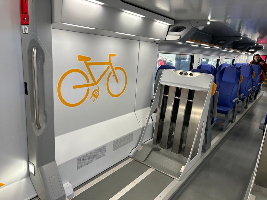 Train dans lequel on peut recharger les vélos à assistance électrique et il n’y avait pas que 3 places, mais 4 wagons avec 6 places chacun.