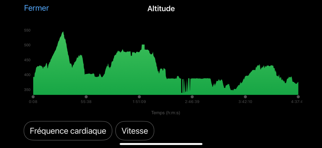 La montre d’Yves donne 560 m de dénivelé et la mienne 822 m. Je suis sûre qu’il y avait moins de dénivelé.