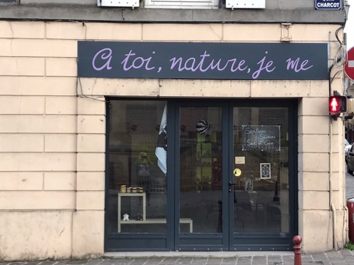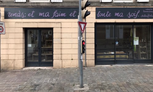 En face du Musée une devanture de magasin avec un extrait de « Bannières de mai »