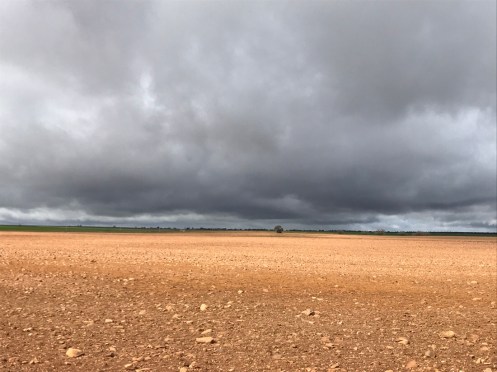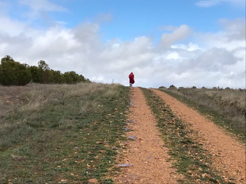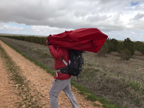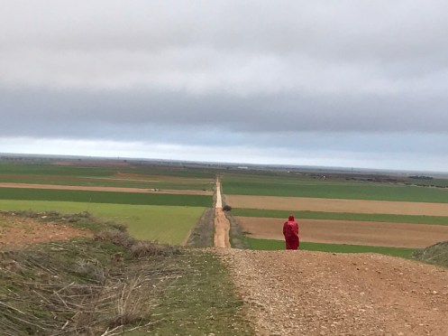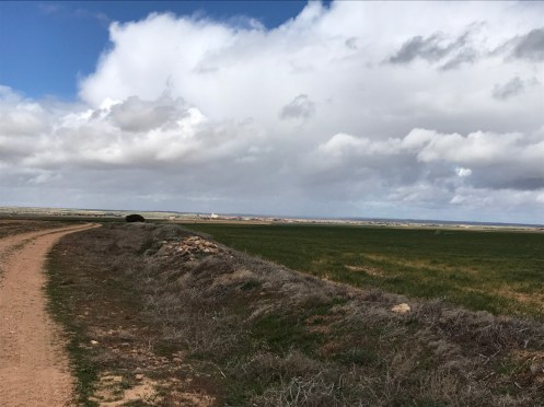 Là-bas, loin, loin, Mota del Marqués. 5 km de rafales de vent de côté. Nous marchons en crabe, le sac à dos nous emporte. Il ne pleut plus heureusement car le sol aurait collé à nos chaussures.