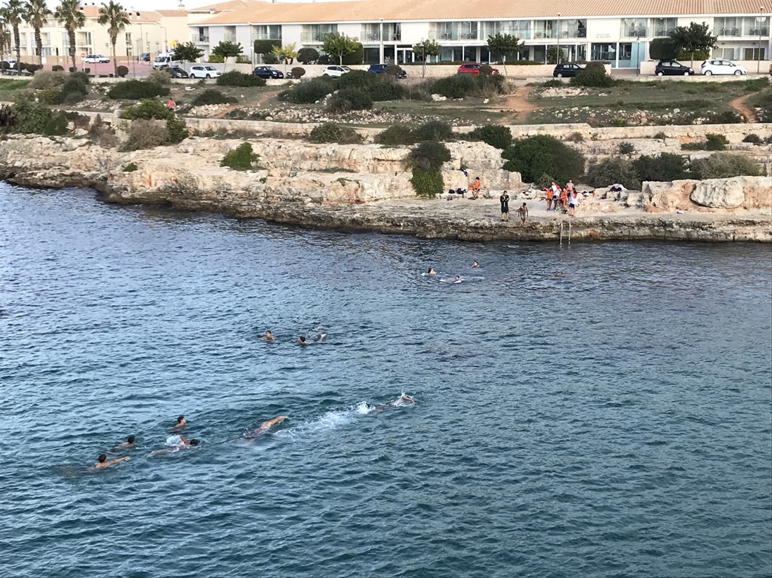 Par chance dans le port d’Addaia nous avons trouvé un petit supermarché où nous avons pu acheter de l’eau et manger un chocolat glacé assis sur un fauteuil mis à la disposition des clients. De quoi recharger les batteries et faire les derniers kilomètres avec un peu plus d’entrain.