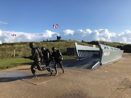 Ouiiii, aujourd’hui il pleut !!! Une petite pluie fine par intermittence depuis le départ. Une pluie qui ne nous gêne pas, sauf pour les photos qui sont sombres. Par contre pendant notre visite du musée du débarquement, c’est le déluge.