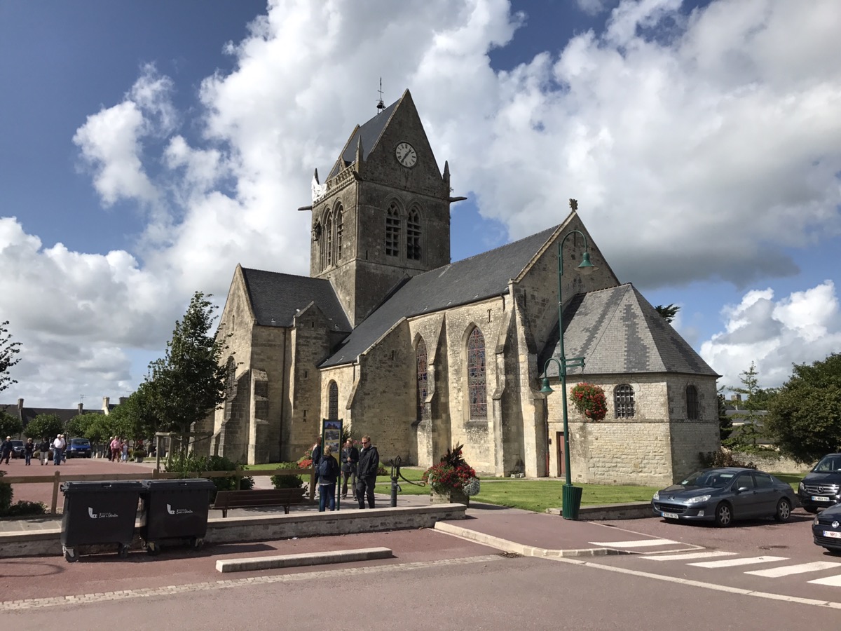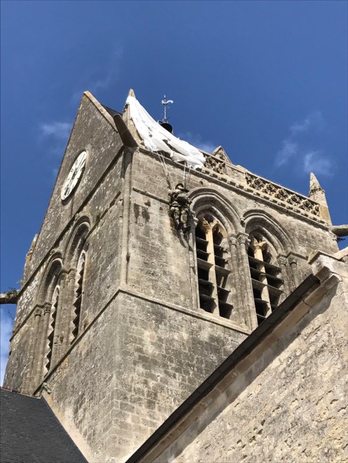 Et nous voici à Sainte-Mère-Eglise avec le soldat John Steele toujours accroché sur le clocher depuis la nuit du 5 au 6 juin 1944.