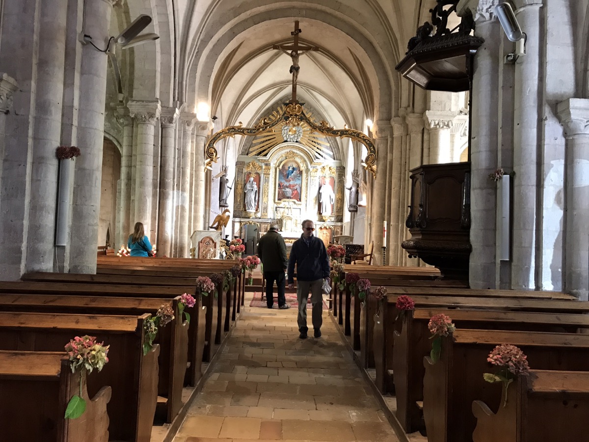 Un mariage se prépare, les travées sont fleuries et il y a des corbeilles de fleurs dans du papier cristal près de l’autel.