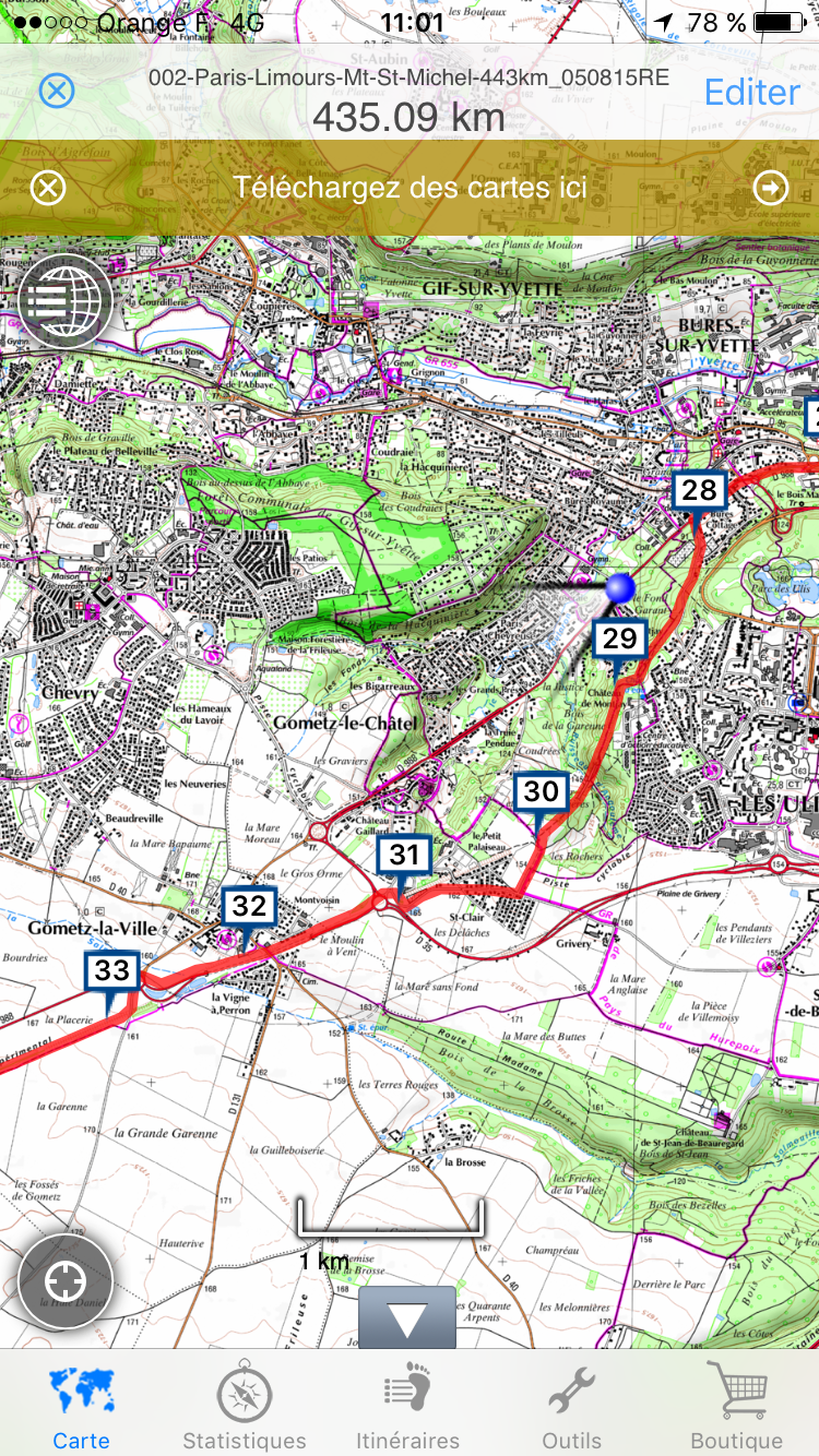 Difficile de trouver la bonne route, la Veloscénie n’est pas fléchée sur cette portion. Malgré le GPS nous nous retrouvons sur une route parallèle. La vraie route est en rouge, notre position est marquée par l’ailette bleue !!!