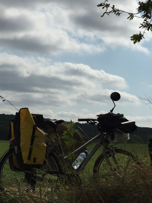 Arrêt pique nique dans un champ avec ce que nous avons dans nos sacoches : un bout de pain, des amandes, du raisin et des pommes de notre verger. Nous ne nous sommes pas arrêtés lorsqu’il y avait des magasins et maintenant depuis un moment il n’y a plus rien, ni épicerie ni restaurant. Allongés dans l’herbe, un régal !!!