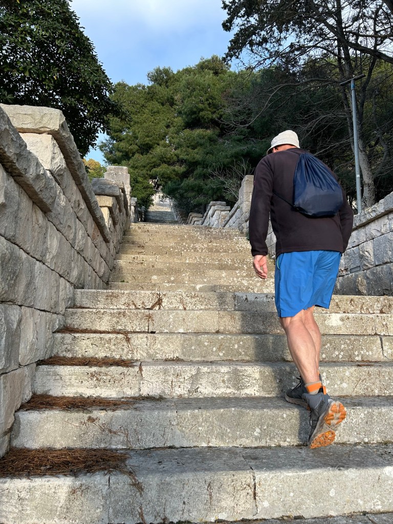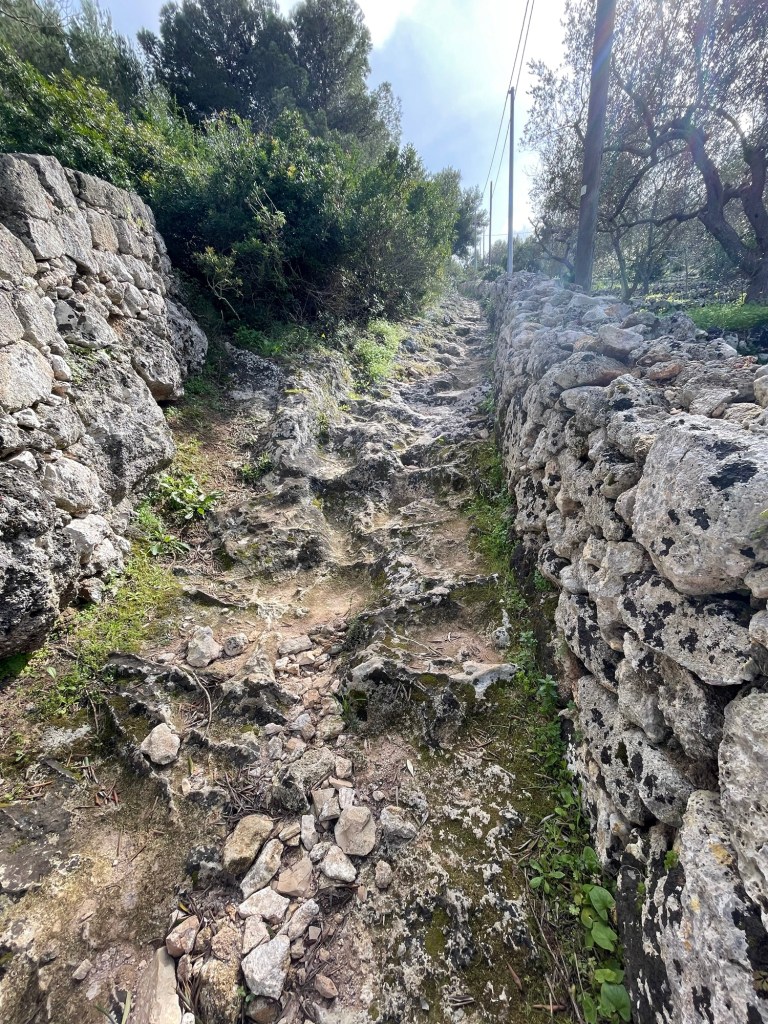 C’est l’application Komoot qui nous a tracé le parcours d’aujourd’hui. Parfait jusque là. Plus de chemin, Yves tente sa chance en escaladant le mur. Pas de chemin au dessus, il redescend en emportant l’escalier en pierre !!!