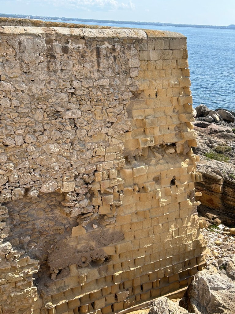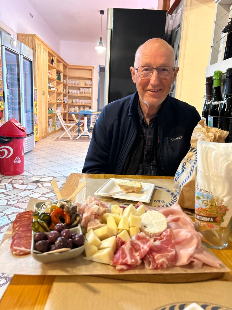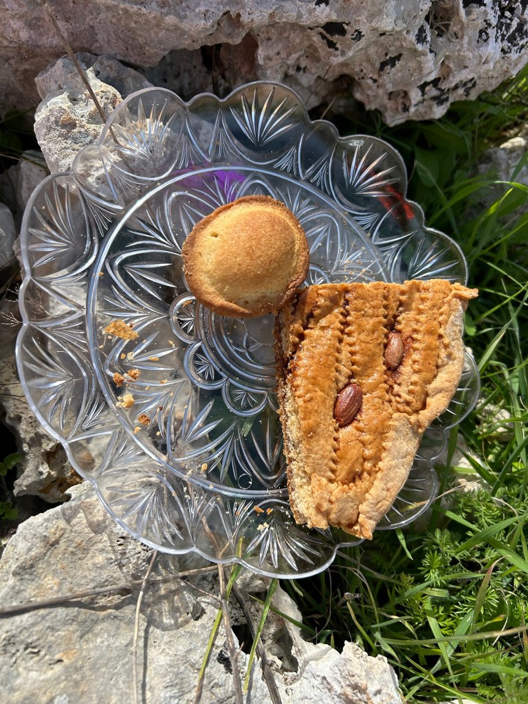Ce matin, à l’hôtel nous avons mangé une part d’une délicieuse tarte aux amandes ainsi qu’un gâteau à la crème ovale dont je ne me rappelle plus le nom. En partant la dame nous a donné cette assiette remplie de gâteaux. Heureusement, car vers 11 h lorsque nous sommes passés à Santa Cesarea Terme nous n’avons pas trouvé de panini, ni d’épicerie et nous avons été bien contents d’avoir cette assiette dans mon sac à dos.