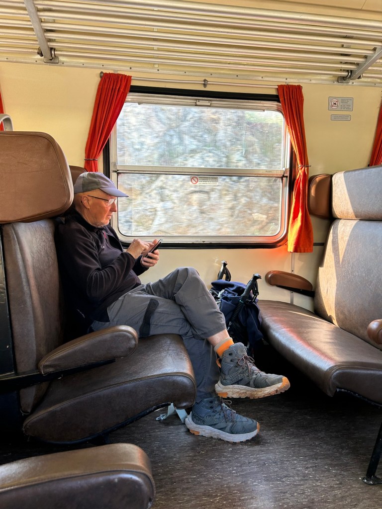 Bien belle journée. Nous étions en T-shirt. Le paysage était magnifique, je n’ai pas vu passer les 25 km… ma cheville va bien. On va essayer de faire plus court demain.