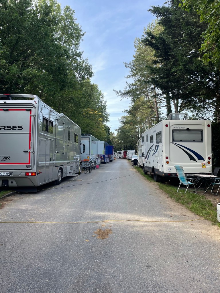 Internationaux du Pas de Calais à Hardelot. Toute la rue est remplie de Vans ou de magnifiques camions pour les chevaux.