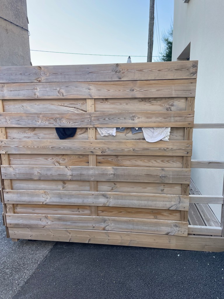Ce soir, nous dormons dans une villa, nous avons fait la lessive et étendu notre linge sur la terrasse. En partant nous promener… fou rire, lorsque nous avons vu notre linge sortir à travers les lames de bois. Retour dans la maison pour tout étendre convenablement.